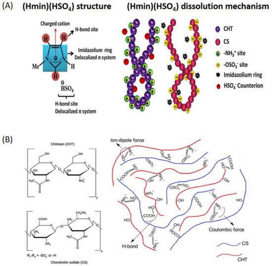 (A) (Hmim)(HSO4) structure and its solvation capacity over the biopolymers and (B) the polysaccharide structures (left panel) and chitosan/chondroitin sulfate (CHT/CS) arrangement (right panel). Reprinted from [28], Copyright 2017, with permission from Elsevier.