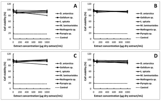 The growing interest in plant-derived compounds for commercial human applications requires the assessment of their possible toxicity. Cytotoxicity studies in cell lines can be considered as a first step in the development of pharmaceutical, cosmetic or food products; toxicity levels (minimal or no toxicity) should be verified [16]. In this test, HT-29 cells, the human colon adenocarcinoma cell line expressing the characteristics of mature intestinal cells, such as enterocytes or mucus-producing cells [17] were used. As seen in Figure 1, the incubation with extracts at low concentrations (1 and 10 μg/mL) did not reveal significant changes in the MTT conversion rates associated with cell viability. Nothogenia sp. and M. laminarioides extracts negatively affected the cellular metabolism of HT-29 cells at 24 and 48 h, respectively, at the maximum concentration evaluated (1000 μg/mL); however, no extract decreased the cell viability in the same way as the positive control (DMSO) that reduced viability to 17.1 ± 1.6% and 18.4 ± 1.4% at 24 and 48 h of exposure, respectively. In general, no statistically significant differences were observed between the type of extract (ethanol and acetone) or between the incubation times (24 and 48 h). According to Galindo et al. [18], a cytotoxic effect can be considered when the viability is less than 75%. None of the seaweed extracts reduced the cellular viability to that level, so they may be considered to not be cytotoxic.