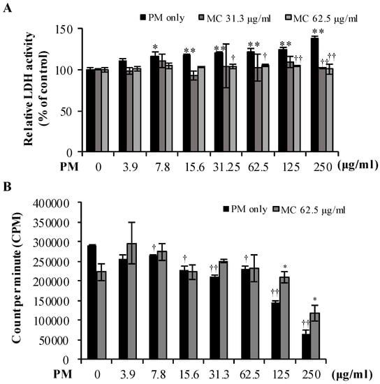 2.2. MC Attenuates PM-Triggered Cytotoxicity of MLE-12 Cells