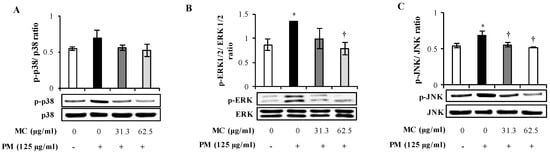 2.4. MC Attenuates the PM-Triggered Activation of MAPK Pathway in MLE-12 Cells