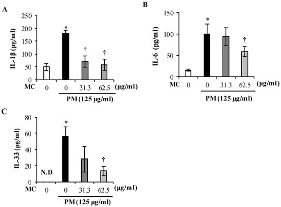 2.5. MC Suppresses the Secretion of Pro-inflammatory Cytokines in PM-Exposed MLE-12 Cells