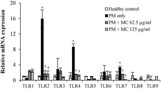 2.6. MC Attenuates the PM-Triggered Activation of TLR2/4/7 in MLE-12 Cells