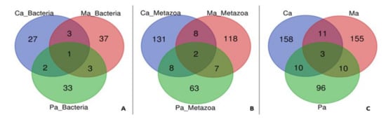 Venn diagrams showing unique and shared proteins among the three ascidians’ species (Ca—Ciona sp., Ma—Molgula sp., Pa—Microcosmus sp.) identified with Proteome Discoverer 2.2.0.388 software (Thermo Scientific) and searched against the Universal Protein Resource Knowledgebase (UniProtKB) for the Metazoa and Bacteria taxonomic selection (2018_07 release). (A) Bacteria section; (B) Metazoa section; (C) Total of proteins retrieved from both Bacteria and Metazoa sections.