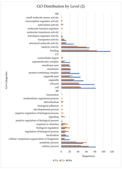 Gene ontology (GO) annotation per Blast2GO software according to GO distribution by level 2. Number of sequences associated with the three GO categories (MF—Molecular Function, CC—Cellular Component, BP—Biological Process) in the three ascidians’ samples (Ca—Ciona sp., Ma—Molgula sp., Pa—Microcosmus sp.).