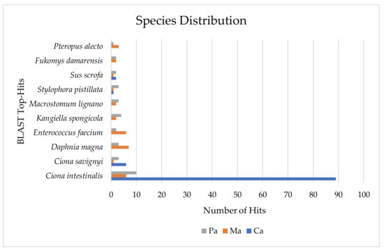 Top 10 hits of species protein distribution found in the three studied ascidians (Pa—Microcosmus sp., Ma—Molgula sp., and Ca—Ciona sp.) identified through the species distribution tool from the Blast2GO software.