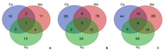 Species distribution analyses obtained with Blast2GO software showing unique and shared taxonomic origins of the identified proteins from three ascidian species (Ca—Ciona sp., Ma—Molgula sp., and Pa—Microcosmus sp.). Venn diagrams built with taxonomic assigned proteins to (A) Bacteria, (B) Metazoan, and (C) total number of taxonomic levels from hits description.