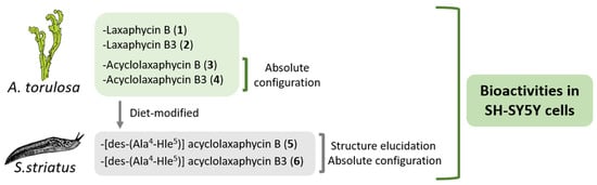 In this study, the biological activities of six B-type laxaphycins were analyzed in SH-SY5Y cells (Figure 1). The already known laxaphycins B (1) and B3 (2), and acyclolaxaphycins B (3) and B3 (4) were obtained from a marine specimen of A. torulosa, whereas two new acyclic compounds, [des-(Ala4-Hle5)] acyclolaxaphycin B (5) and [des-(Ala4-Hle5)] acyclolaxaphycin B3 (6), were isolated from the herbivorous gastropod Stylocheilus striatus. The absolute configurations of 3 and 4, as well as the complete structural elucidation of the new diet-derived peptides 5 and 6 are also provided.