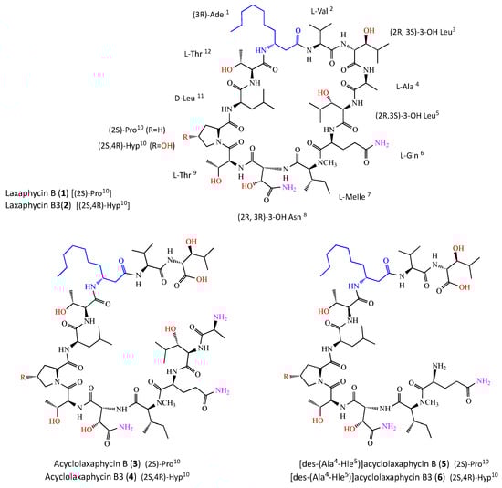 Laxaphycins are divided into two sub-families, laxaphycin A-type and laxaphycin B-type peptides. Laxaphycin B-type members such as laxaphycins B, B2, and B3 have presented antifungal, antimicrobial and cytotoxic activities [,,,], while laxaphycin A-type compounds have shown only weak cytotoxicity [,,].