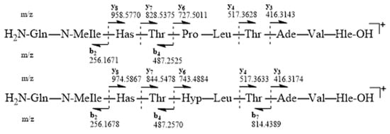 ESIMS-MS fragmentations for 5 and 6 were consistent with the proposed amino acid sequences and the presence of y ions at m/z 416.3143 (y3), 517.3628 (y4), 727.5011 (y6), 828.5375 (y7) and 958.5770 (y8), and b ions at m/z 487.2525 (b4) and 256.1671 (b2) for compound 5, as well as y ions at m/z 416.3174 (y3), 517.3633 (y4), 743.4884 (y6), 844.5478 (y7) and 974.5867 (y8), and b ions at m/z 814.4389 (b7), 487.2570 (b4) and 256.1678 (b2) for compound 6 (Figure 3).