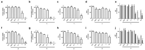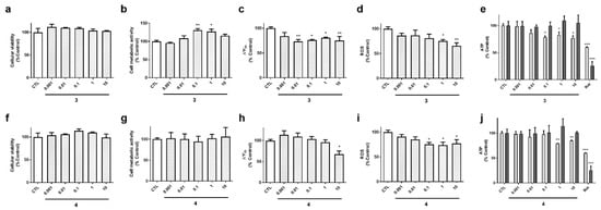 Effect of acyclic compounds isolated from A. torulosa on SH-SY5Y cells. Compounds 3 (a–e) and 4 (f–j) were added to neuroblastoma cells for 24 h and cellular viability, metabolic activity, ∆Ψm, ROS release and ATP levels were determined. The levels of ATP were assessed at 6 and 24 h (light and dark bars, respectively). Concentration expressed in µM. Mean ± SEM of three experiments performed by triplicate. Values are presented as percentage of control cells. * p < 0.05, ** p < 0.01, *** p < 0.001