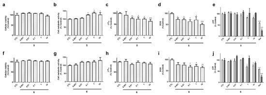 Effect of acyclic compounds obtained from S. striatus on cell viability and mitochondrial function in human neuroblastoma cells. SH-SY5Y cells were treated with compounds 5 (a–e) and 6 (f–j) for 24 h and their effects on cell viability, metabolic activity, ∆Ψm, ROS and ATP levels were assessed with LDH assay, MTT test, TMRM dye, carboxy-H2DCFDA and a commercial kit, respectively. ATP assay was performed at 6 h (light bars) and 24 h (dark bars). Concentration expressed in µM. Mean ± SEM of three experiments performed by triplicate. Values are presented as percentage of control cells. * p < 0.05, ** p < 0.01, *** p < 0.01