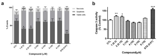 In view of the cytotoxicity displayed by cyclic laxaphycins 1 and 2 in LDH and MTT assays, the type of cell death produced by compounds was determined. SH-SY5Y cells were treated with compounds for 24 h. Laxaphycins 1 and 2 were used at IC50 values obtained from MTT assay (0.3 and 0.15 µM, respectively). Otherwise, acyclic laxaphycins 3, 4, 5 and 6 were tested at 10 µM. Cells were co-stained with Annexin V-Fluorescein (FITC) and propidium iodide (PI) and the fluorescence was analyzed by flow cytometry (Figure 7a). The percentages of apoptotic cells, including early apoptotic cells (Annexin V positive and PI negative) and late apoptotic cells (Annexin V positive and PI positive), and necrotic cells (Annexin V negative and PI positive) were calculated. Cells treated with compounds 1 and 2 produced a significant decrease in cell survival (around 60% of control cells). The values of Annexin-V-positive cells in these treatments confirmed that cyclic B-type laxaphycins triggered an apoptotic process. The addition of 1 and 2 produced a 50.4% ± 4.8% (p < 0.001) and 46.4% ± 4.8% (p < 0.001) of apoptotic cells, respectively. As expected, treatment with staurosporine (STS) also generated apoptosis in neuroblastoma cells (63.3% ± 3.2%, p < 0.001). On the other hand, acyclic laxaphycins did not show any significant effect on cell viability, agreeing with our previous results.