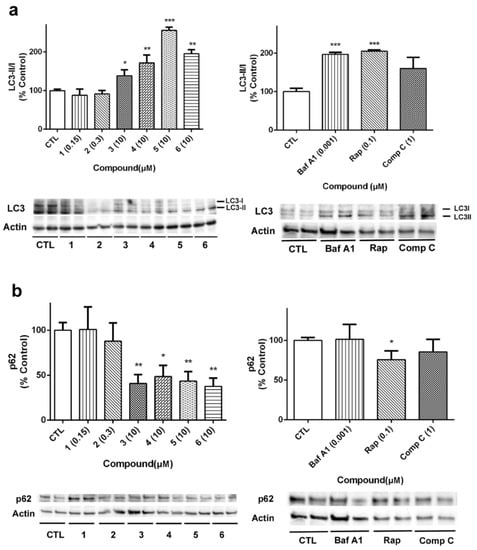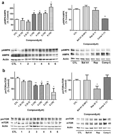 Considering the results obtained with acyclic B-type laxaphycins in the mitochondrial function and our previous work with A-type laxaphycins [], we decided to evaluate the effect of these compounds on the autophagic flux. With this purpose, SH-SY5Y cells were treated with laxaphycins B for 24 h, and the expression of proteins involved in autophagy was determined by Western blot. Bafilomycin A1 (Baf A1), an inhibitor of the fusion of autophagosomes and lysosomes, rapamycin (Rap), a mTOR inhibitor, and compound C (Comp C), an AMPK inhibitor, were used as positive controls in these assays []. Firstly, the effect of compounds on AMPK activation was determined, since this kinase is known to activate autophagy under circumstances of energy depletion []. Acyclic peptides produced a significant increase in the activation of AMPK, with compound 6 being the most active (Figure 8a). As expected, Comp C at 1 µM inhibited kinase activity. Then, we analyzed the expression of mTOR, considered the master regulator of the autophagic process. Cyclic laxaphycins 1 and 2 did not affect to the protein expression, whereas the acyclic peptides produced a significant reduction in its activation (Figure 8b). Treatment with 0.1 µM Rap also reduced mTOR activation.