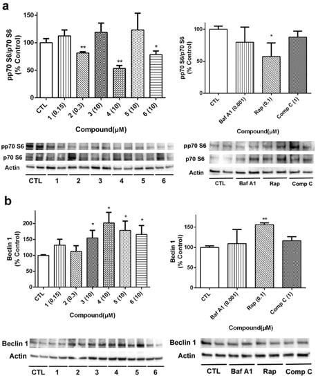 The activation of p70 S6 kinase, an mTOR downstream target, was also determined (Figure 9a). The cyclic peptide 2 and the acyclic laxaphycins 4 and 6 diminished p70 S6 phosphorylation, reaching percentages among 53.5%–78.6% of untreated cells. Next, we analyzed the expression of beclin 1, a component of the complex that starts autophagosome formation []. As can be seen in Figure 9b, acyclic compounds 3, 4, 5 and 6 generated an increase in beclin1 expression. Treatment with the autophagy activator Rap also augmented its expression.