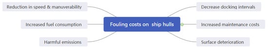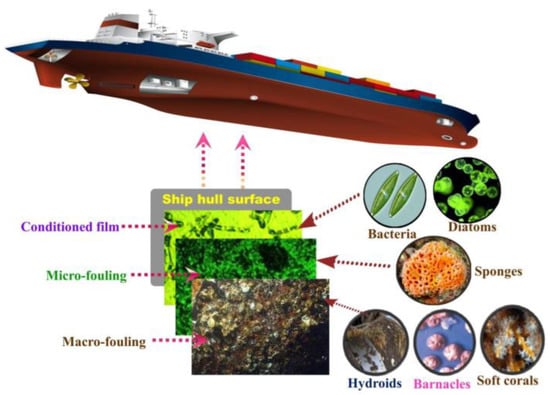 Various fouling organisms easily attach to ships, oil platforms and breeding facilities in the ocean [3]. Barnacles and other invertebrates are firmly attached to the hull surface by secreting a biological adhesive. As the barnacle grows, its edges will destroy the anticorrosion layer on the hull surface, thereby accelerating the hull corrosion [4]. As shown in Figure 1 [5], when the hull surface is attached, fouling organisms will corrode the hull surface and increase the roughness of the hull surface, thereby reducing the speed of the ship [6,7,8], increasing fuel consumption and greenhouse gas emissions [9,10]. In recent years, with the rapid development of offshore industries such as submarine oil and marine power generation, the damage of marine fouling organisms to man-made facilities has become more severe. For example, when an offshore oil platform is attached, it will increase the weight of the facility and weaken its ability to resist tsunami and storm risks. In addition, fouling organisms can block drainage pipes, jeopardizing the safety and service life of marine facilities. Some marine fouling organisms enter the non-native land by attaching to the bottom of the ship, thereby causing biological invasion and causing great harm to the global marine ecology [11]. Every year, a lot of money is invested in ship surface cleaning and maintenance of marine facilities. With the continuous development of the human marine economy, the economic losses caused by marine fouling organisms are getting larger and larger, thus, effective and economic prevention methods are getting more and more attention.