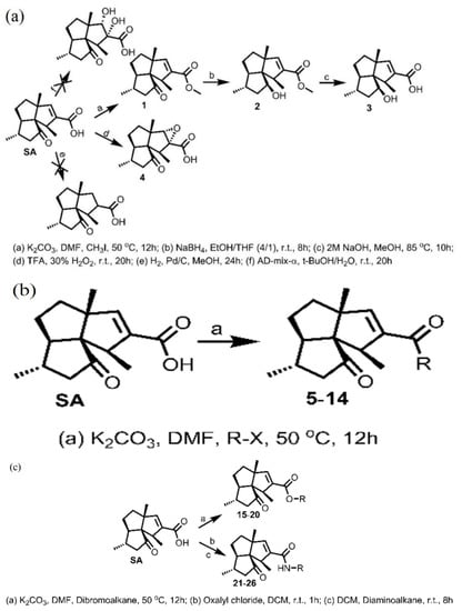 Research and preparation of subergorgic acid (SA) compounds. (a) Identification of bioactive functional groups of SA. (b) Synthesis of benzyl esters of SA. (c) Synthesis of SA derivatives containing methylene chain of various lengths [28].