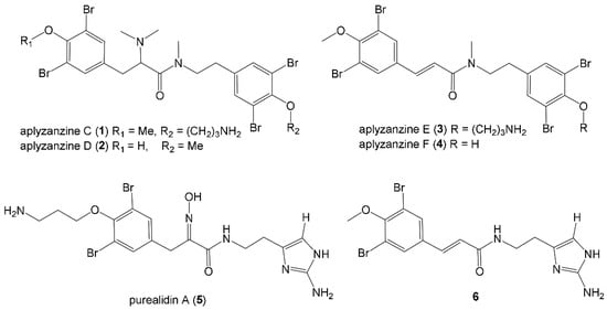 In nature, marine organisms have evolved many biological strategies to interact with microorganisms to protect themselves from pathogens or from being parasitized. [29]. In particular, sponges and their associated microbiota produce compounds that interfere with quorum sensing (QS) mechanisms [30,31]. Quorum sensing is a synchronization mechanism within a bacterial population. The bacteria use QS to communicate, regulate their behavior and assess their population density. The use of marine biological secretions to interfere with bacterial QS can effectively inhibit the formation of bacterial biofilms, making it difficult for other organisms to attach [32]. Tintillier et al. [33] studied the marine sponge Pseudoceratina sp. 2081 and isolated four new tetrabromotyrosine derivatives exhibiting antifouling and quorum sensing inhibition (QSi) properties. Structures of the isolated bromotyrosine metabolites is showed in Figure 4. They tested the antifouling activity of 6 kinds of extracts. Among the six compounds tested, the most active were 1, 3 and 5. The mode of action of those compounds are not based on toxicity. They operate through a targeted mode of action on bacteria and microalgae, as they only affect adherence and not growth.