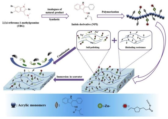 Indole derivatives found in bryozoans and ascidians have been shown to have antifouling effects [34]. However, due to the uncontrollable release rate of indole derivatives in antifouling coatings, the effect of antifouling coatings with added indole derivatives is poor. Feng et al. [35] prepared acrylate resins suspending the indole derivative structure in their side chain by the free-radical polymerization. Its preparation method and antifouling principle are shown in Figure 5. The prepared indole derivatives have good antibacterial and algae inhibiting effects. The self-polishing rate of the acrylate resin polymerized with indole derivatives is reduced, thereby obtaining a long-term self-polishing effect. The dynamic simulation measurements and static immersion measurements of the coating were performed to study in the marine environment. The results show that acrylate resin containing indole derivatives has long-lasting efficacy in biological control and the acrylate resins suspending the indole derivative structure in their side chain can make fouling organisms difficult to grow. In addition, indole derivatives inhibit the marine algae growth by interfering with the equilibrium of calcium ions in algal cells and decreasing the abundance of cellular Ca2+ [36]. Under the action of seawater, the acrylic resin continuously renews its surface through the hydrolysis of ester groups. This self-polishing property makes attached organisms easily fall off the surface, exposing new indole derivative structures. Therefore, the combination of these two functions of the resins can significantly improve their antifouling properties. Since indole derivatives are easily degraded by microorganisms, they will not cause a great impact on the ecological environment.