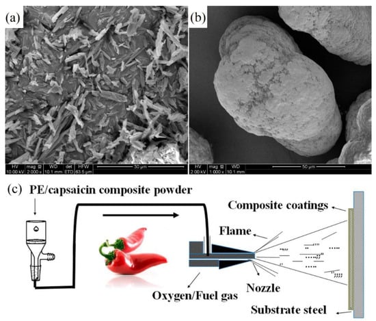 Capsaicin extracted from chili is a spicy vanillin amide alkaloid with antibacterial effects and is also regarded as a natural non-toxic antifoulant [47]. Wang et al. [48] conducted extensive research on capsaicin and its derivatives and reported six capsaicin derivatives for the first time, proving that capsaicin and its derivatives have excellent antifouling properties. Liu et al. [49] used capsaicin as an antifoulant and used high-density polyethylene (HDPE) as a substrate to make an antifouling coating by flame spray. Capsaicin, HDPE and coating preparation methods are shown in Figure 6. Compared with the raw materials, the morphology and grain size of capsaicin in the coating have changed significantly, and the coating has significant antibacterial and antifouling capabilities. In addition, capsaicin can be extracted from capsicum relatively easily, thus, this antifouling technology has low cost and high feasibility, and is suitable for widespread promotion.