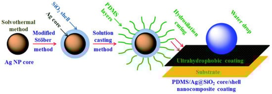 Due to the high price and difficulty in preparation, fluoropolymers currently have few commercial products, and silicone polymer antifouling coatings have become a research and development hotspot. The silicone polymer has good desorption ability, and can easily make marine fouling organisms fall off by brushing or flowing. For example, PDMS has a combination of low surface energy and low elastic modulus, and it has gradually become the base of most antifouling coatings. Selim et al. [54] prepared a super-hydrophobic PDMS-Ag@SiO2 core-shell nanocomposite antifouling coating using the modified Stöber methods. The formation process of the coating is shown in Figure 8. The Ag@SiO2 core-shell nanofiller was inserted into the surface of the PDMS material by the solution casting method, and a strong coating was formed according to the hydrazination curing mechanism. The water contact angle (WCA) of the coating was determined to be 156°, and the surface free energy was 11.15 mJ/m2. Biological tests prove that the coating has significant inhibitory effects on different bacterial strains, yeasts and fungi.