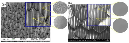 SEM images of shark skin and biomimetic shark skin: (a) the riblet structures of shark surface; (b) the surface of biomimetic shark skin prepared [64].