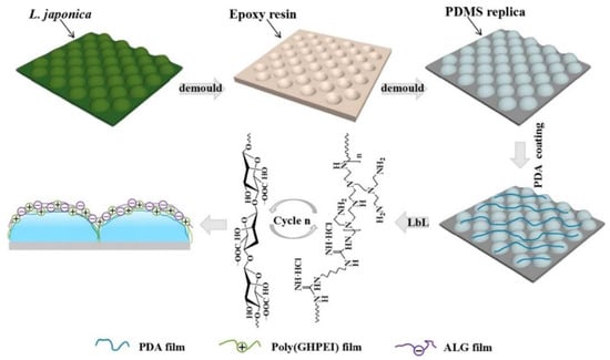 In marine environment, Laminaria japonica still has excellent antifouling ability in a relatively static state compared to those parade creatures. Zhao et al. [65] reported the synergistic effect between surface topography and chemical modification, and used sodium alginate and guanidine-hexamethylenediamine-PEI to replicate the surface microstructure on the surface of PDMS replicas by a layer-by-layer assembly method. The production process is shown in Figure 10. The water contact angle of PDMS with a microstructured surface is reduced to 35.3°, which is more hydrophilic. After the algae test and the bacteria test, the surface has extremely strong antifouling performance, and the antibacterial ability is up to 96.2 ± 1.3%.