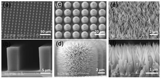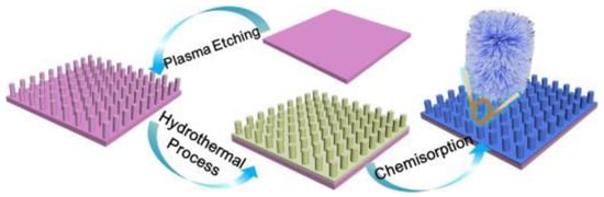 Lotus leaf surface is one of the most famous superhydrophobic surfaces and displays excellent anti-biofouling performances [66,67]. Jiang et al. [68] investigate the super-repellency of the lotus leaf towards the bacterial medium, together with its mechanical bactericidal activity against the attached bacteria, and for the first time reveal the synergistic antibacterial effects of its bacterial repellency and physical rupture by nanotubes. They designed and developed a hierarchically structured superhydrophobic surface integrated with regularly spaced micro-pillar arrays and packed nanoneedles. This surface can remarkably prolong its efficiency under much harsh conditions with respect to the conventional superhydrophobic surfaces, without causing any potential antimicrobial resistance. Schematic illustration of fabrication procedure of lotus leaf-like structures is shown in Figure 11, and the microscale structure of the surface is showed in Figure 12. The surface static water contact angle exceeds 170°, and the rolling angle is less than 1°. The surface’s anti-adhesion efficiency for E. coli can reach more than 99%. A small amount of adhered bacteria can be completely killed, effectively overcoming the disadvantages of bacteria adhesion accumulation on the surface of a single structure sterilization.