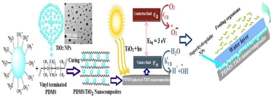 The use of photocatalytic to enhance the antifouling ability of the hull has attracted the attention of many scholars [69]. When some nanocomposites are exposed to sunlight, their surfaces exhibit strong oxidizing and reducing properties. Considering both economic and ecological aspects, this method has no pollution and low cost. TiO2 nanocrystals are widely used materials that modify coating surfaces to provide considerable mechanical reinforcement and surface wettability. Selim et al. [70] conducted an in-depth study on photocatalytic antifouling coatings, and prepared a PDMS/TiO2 hybrid nanocomposite. Its preparation method and action mechanism are shown in Figure 13. When sunlight illuminates TiO2 nanoparticles, it will excite carriers such as electrons and holes. The photogenerated electrons are transferred from the valence band to the conduction band, while the holes remain in the valence band. The electrons in the conduction band can be reduced to superoxide anion radicals, and the holes with strong oxidizing ability can oxidize water to produce hydroxyl groups. Hydroxyl groups still have strong oxidizing properties, which can attack the unsaturated bonds of organic substances or extract H atoms of organic substances to generate new free radicals. The chain reaction is excited and the bacteria are decomposed. In addition, the modified material exhibits strong hydrophilicity, which will produce a thin water film on the surface to block the adhesion of fouling organisms.