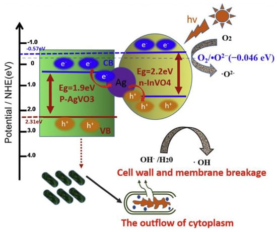 However, because the band gap of TiO2 nanoparticles is 4% of sunlight, they can only absorb ultraviolet rays. Therefore, it is necessary to further improve the visible light absorption effect of the material. Zhang et al. [71] synthesized a new visible light-sensitive InVO4/AgVO3 photocatalyst with a PN node structure through ion exchange and in-situ growth process. Its mechanism of action is shown in Figure 14. When the bacteria come into contact with the catalyst, the H+ and O2- ions catalyzed by the surface of InVO4/AgVO3 will destroy these cell walls and cell membranes, resulting in severe cell rupture, cell effluent and DNA molecule destruction. About 99.9999% of Pseudomonas aeruginosa (P. aeruginosa), Escherichia coli (E. coli) and Staphylococcus aureus (S. aureus) were killed over 0.5 InVO4/AgVO3 at 30 min.