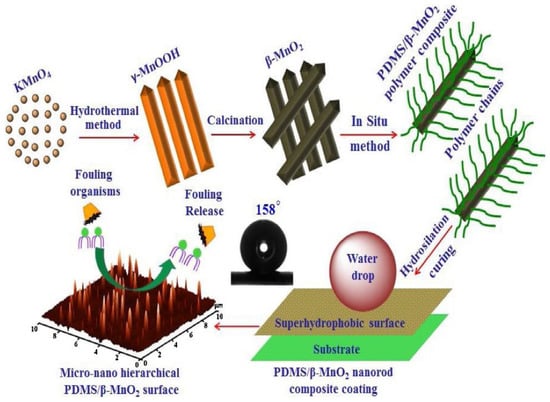 Selim et al. [74] prepared a superhydrophobic coating of silicone/β-MnO2 nanorod composite for marine antifouling. They studied how the self-cleaning and antifouling features were affected by controlling the β-MnO2 nanorod preparation and distribution in the silicone matrix. The preparation method of β-MnO2 and the construction method of the coating are shown in Figure 16. PDMS, as the substrate of the coating, is itself a low surface energy coating. By using β-MnO2 nanorods to construct a rough structure on the surface of PDMS, the coating is made superhydrophobic. The composite coating prevents fouling organisms from adhering through super-hydrophobicity and low surface energy. In addition, β-MnO2 nanomaterials also enhance the stability of the coating to temperature and PH.