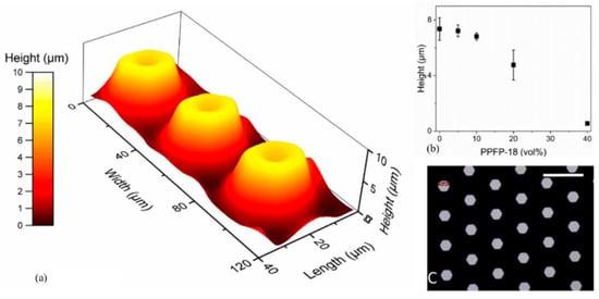 Microstructure of the coating surface. (a) A three-dimensional (3D) height profile of the photo-embossed features in a polymerized coating without the addition of perfluorinated oil. (b) Measured feature height. (c) Micrograph of coating surface. [78].