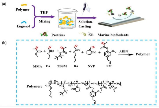 Xie et al. [80] designed a new type of antifouling costing with a longer period of validity based on a synergistic antifouling strategy. As shown in Figure 19, the antifouling paint is made of polyacrylates, tert-butyldimethylsilyl methacrylate (TBSM), eugenol methacrylate (EM) and poly(vinylpyrrolidone) (PVP). EM can add eugenol groups to the coating covalently, so that the coating has the function of contact inhibition. PVP can enhance the hydrophilicity of the coating to block biological adhesion. Eugenol can be gradually released into the sea water to expel marine life. Methyl methacrylate (MMA) ethyl acrylate (EA) and n-butyl acrylate (BA) are used in the coating to enhance the mechanical properties and adhesion of the coating, thereby improving the durability of the coating. TBSM can make the coating have a stable hydrolysis rate, so that eugenol can be released stably. Antifouling tests show that the coating can effectively prevent protein adsorption, bacterial adhesion and diatom adhesion. The actual marine environment test shows that the validity period of the coating is at least 8 months. This research has created conditions for the development of environmentally friendly, efficient and long-lasting antifouling paints.
