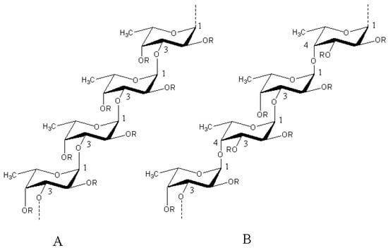 Two main types skeletal structure of fucoidan. Structure of type (A) fucoidan are constructed of only repeating (1→3)-linked α-l-fucopyranose residues whereas type (B) consist of alternating (1→3)- and (1→4)-linked α-l-fucopyranose residues. R represents the places of potential attachment of carbohydrate (α-l-fucopyranose, α-d-glucuronic acid) and noncarbohydrate (sulfate and acetyl groups) substituents [8].