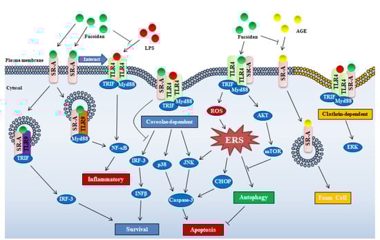 Additionally, TLR3 and TLR9 participate in fucoidan associated activity. Internalized SR-A interacts with TLR3 to promote cell survival via TLR3/IRF-3 pathway or with TLR9 to mediate cell to undergo inflammation or death via TLR9/TRIF/NF-κB/TNF-α (tumor necrosis factor-α) pathway [10], which suggests that fucoidan plays pro-survival or pro-death role via interaction between SR-A and TLR3/TLR9 (Figure 2).