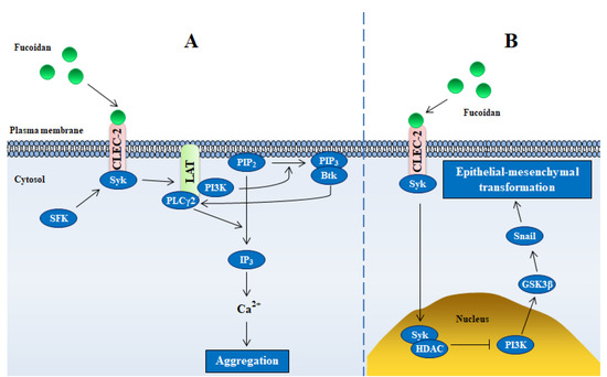 Schematic illustrating mechanisms of fucoidan-mediated intracellular signaling through CLEC-2. (A,B) represent platelet cells and gastric cancer cells, respectively. Abbreviations in figure: SFK—Src family kinases; Syk—spleen tyrosine kinase; PI3K—phosphoinositol 3 kinase; PIP2(3)—phosphoinositol 4,5(3)-bisphosphate (trisphosphate); PLCγ2—phospholipase Cγ2; Btk—Bruton’s tyrosine kinase; GSK3β—glycogen synthase kinase-3 beta; HDAC—histone deacetylase.