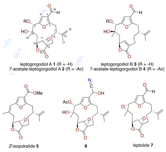 These antecedents prompted us to re-examine two extracts of Leptogorgia sp., from which new furanocembranolides 1–5 were obtained, together with the previously known leptolide (7) [14]. Furthermore, we treated leptolide to obtain compound 6 (Figure 1) to assess a new furanocembranolide with different substituents at position C-4.
