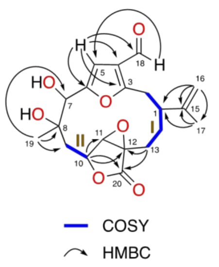 The 1H–1H-COSY experiment confirmed two spin systems: H2-2–H2-13 (fragment I) and H2-9–H-10 (fragment II) (Figure 2). The HMBC correlations H2-16/C-17, C-1 and H3-17/C-16, C-15, C-1 locate an isopropenyl group at C-1 of fragment I, while the correlations H3-19/C-7, C-8 and C-9 permits a lengthening of fragment II by connecting a vicinal dihydroxyl moiety to C-9. The north end of both fragments II and I are connected together by insertion of a furane ring, which is in agreement with the HMBC correlations H-5/C-3, C-4, C-6 and H2-2 with C-3. The southern ends of fragments I and II between C-13 and C-10 are joined to an epoxy lactone, as deduced from the HMBC correlations H-10/C-11, C-20; H2-13/C-20, C-11, C-12; and H2-14 with C-12. Therefore, the structure of compound 1 was established, showing nine degrees of unsaturation as shown in Figure 2.