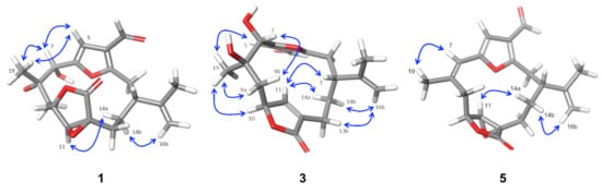 The relative configurations of compounds 1−6 were established by combination of nuclear Overhauser effect spectroscopy (NOESY) experiments, molecular mechanics [26], analysis of key chemical shifts and comparison of their spectroscopic data with those of previously described furanocembranoids [27] (Figure 3).