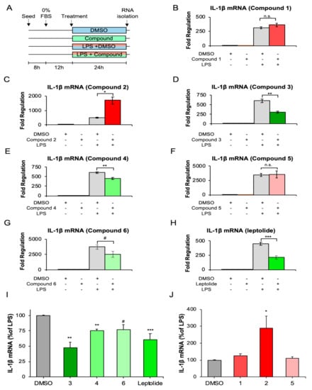 Expression of IL-1β mRNA in vitro after LPS (lipopolysaccharide) stimulation and/or furanocembranolide treatment. (A) Experimental design. (B–H) Representative experiments showing the total fold change of IL-1β mRNA expression in comparison with basal conditions (vehicle alone): Each bar depicts the mean value between quintuplicate qPCR (quantitative real-time polymerase chain reaction) runs, and error bars represent standard deviation. (I,J) IL-1β mRNA fold regulation normalized to the LPS + DMSO (dimethylsulfoxide) response (considered 100%), separated into furanocembranolides that increase (I) or decrease (J) the response. Each bar represents the mean between three independent experiments, and error bars show standard error of the mean. Statistical differences were assessed by two-way ANOVA, followed by Holm–Sidak post hoc tests (* p < 0.05, ** p < 0.01 and *** p < 0.001) and by pairwise comparison of raw data by t-test (# p = 0.051).