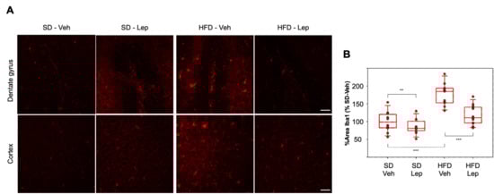 Leptolide treatment ameliorates microgliosis triggered by HFD (high-fat diet): (A) Representative immunofluorescence images from paraffin sections of mouse brains stained with Iba1. Calibration bars: 50 μm. (B) Immunohistochemical quantification of Iba1 protein expression, measured as percentage of Iba1-positive area per section, normalized to SD-Veh and considered 100% (n = 11–13 mice per group): Each dot represents the mean value of Iba1 (ionized calcium-binding adapter molecule 1)-positive area (between dentate gyrus and cortex) for an individual mouse. Statistical differences were assessed by three-way ANOVA followed by Holm–Sidak post hoc tests. * p < 0.05, ** p < 0.01 and *** p < 0.001. Only biologically relevant differences are shown. Abbreviations: SD = Standard Diet; HFD = High-Fat Diet; Veh = Vehicle; Lep = Leptolide.