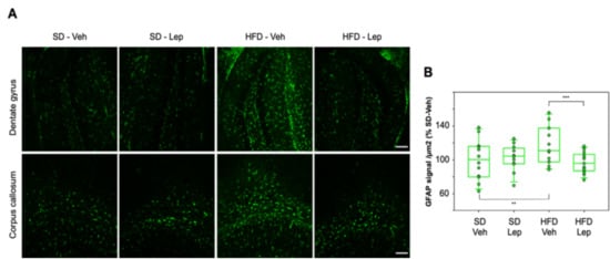 Glial fibrillary acidic protein (GFAP) is an intermediate filament protein expressed by astrocytes and is also considered a good marker of astrogliosis [29]. HFD resulted in an increase in GFAP expression, and this phenotype was partially reverted by treatment with leptolide in both regions studied, with a significant decrease in astrogliosis. Within SD-fed mice, leptolide had no significant effects (Figure 6A). For statistical analyses, we performed three-way ANOVA, as stated before. Diet, drug and region proved to be statistically significant factors. There was a tendency towards interaction between diet and drug (p = 0.08). Leptolide treatment of HFD-fed mice resulted in a significant decrease in astrogliosis (Figure 6B).