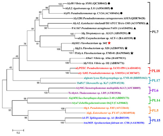 The phylogenetic analysis of AlyS02 and related alginate lyases. Bar, 0.2 substitutions per nucleotide position. The red five-pointed star indicates AlyS02 in this study. Different families are shown in different colors. In the PL7 family, black triangles, solid circles, boxes and five-pointed stars indicate subfamily 1, subfamily 3, subfamily 5 and subfamily 6, respectively.