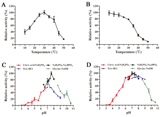Meanwhile, the effects of pH (3.0–10.6) on the purified enzyme were investigated. Alginate lyase activities in different buffers, including 20 mM citric acid-NaH2PO4 (pH 3.0–7.0), NaH2PO4-Na2HPO4 (pH 6.4–8.0), Tris-HCl (pH 7.0–9.0) and glycine-NaOH (pH 8.6–10.6), were measured to assess the influence of pH on AlyS02 activity, calculating the relative enzyme activity by taking the activity at optimal pH as 100%. In addition, to test the effect of pH on the stability of AlyS02, the enzyme was incubated at 4 °C for 24 h in different buffers above (pH 3.0–10.6); here, the residual enzyme activities were measured and the maximum residual activity was considered as 100%.