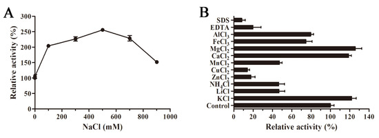 The influence of NaCl concentration on AlyS02 activity is revealed in Figure 6A. AlyS02 was activated within 100–900 mM of NaCl, and the activity reached the maximum with 500 mM NaCl, approximately 250% of relative activity compared to that without NaCl (Figure 6A). The results indicated that AlyS02 was a salt-activated and salt-tolerant alginate lyase, but not dependent on Na+. This phenomenon also partially explained the influences of various buffer solutions in the tests of pH characteristics. The salt-activated property was common in the enzymes isolated from marine bacteria (Table 2), where the survival of these strains and activation of the enzymes need the environment to have a certain degree of NaCl concentration. The effects of various metals (1 mM) on AlyS02 activity were also examined. As exhibited in Figure 6B, the enzyme activity was increased with Mg2+, Ca2+, and K+, just as most alginate lyases listed in Table 2. However, the enzyme activity was prominently reduced with SDS, EDTA, Cu2+ and Zn2+, and partially decreased with other metal ions such as , Li+, Mn2+, Al3+ and Fe3+. Similar situations could be found in many alginate lyases originated from marine environments; most trivalent and divalent heavy metal ions and other reagents such as SDS and EDTA can significantly inhibit the activities of the enzymes, perhaps owing to the denaturation of enzymes (Table 2). However, some exceptional cases exist in previous studies. Interestingly, SDS could activate AlyYKW-34 from Vibrio sp. YKW-34 [75]. The activity of Aly2 from Flammeovirga sp. MY04 would be enhanced in the presence of EDTA [73], and Ba2+ and Co2+ showed obviously activating effects on aly-SJ02 from Pseudoalteromonas sp. SM0524 [36]. The influences of ions on the enzymes derived from diverse species may be different due to the various environments for diverse bacteria strains to survive and evolve [25].