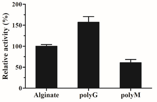 To investigate the substrate specificity of AlyS02, three kinds of polymeric substrates (polyG, polyM and sodium alginate) were utilized. The relative catalytic activities of AlyS02 against tested substrates are shown in Figure 7. The result indicated that this enzyme is a bifunctional alginate lyase which degrades both polyM and polyG (Figure 7). Most alginate lyases are specific to M block or G block, called monofunctional enzymes [33,35,61,74]. The utilization of those enzymes was limited except for some particular purpose such as preparation of polyM block from alginate through degrading the polyG and polyMG blocks [76]. However, AlyS02 with broader substrate specificity was capable of degrading alginate more effectively, similar to other bifunctional alginate lyases reported [11,19,29,36,37]. The Q(I/V)H conserved sequences important for substrate recognition and catalysis exist in almost all the alginate lyases from PL7 family [25,55]. In the current study, AlyS02 was found to degrade polyG more efficiently than the other assayed polymeric substrates (Figure 7); this result corresponded with the QIH sequence in the primary structure of AlyS02 described previously. Nevertheless, there still are some exceptions to this rule. Yagi et al. reported that rAlgSV1-PL7 with QVH was highly active against polyG [27]. The polyM-preferred FlAlyA contains QIH in the amino acid sequence [26].