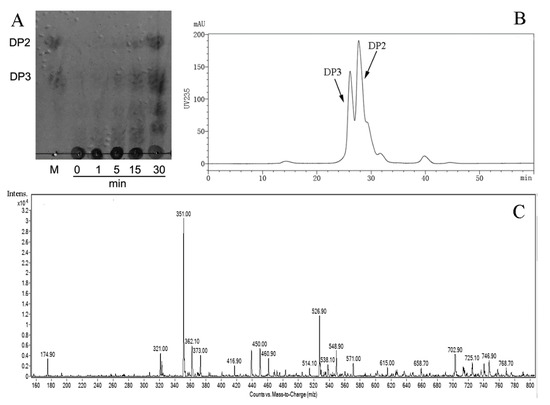 First, the products were analyzed with a solvent system (1-butanol/acetic acid/water 2:1:1, v/v/v) using a TLC plate (TLC silica gel 60 F254, Merck KGaA, Darmstadt, Germany). After spraying with sulfuric acid/ethanol reagent (1:4, v/v), the TLC plate was heated at 80 °C for 30 min to visualize the spots. The mixture of disaccharide and trisaccharide was applied as a marker, and the total uronic acid concentration was 0.2% (w/v).