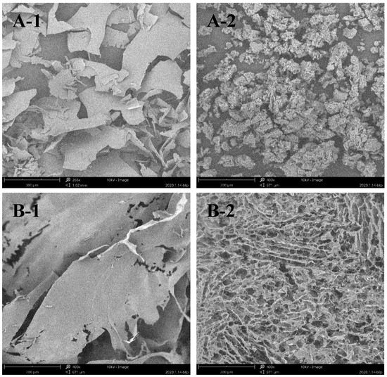 SEM observation of: the microstructure of the original long-chain sulfated polysaccharides (A-1 and B-1); and the depolymerized sulfated polysaccharides (A-2 and B-2).