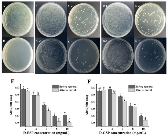 The antibacterial activity of sulfated polysaccharides against ETEC K88 based on the plate smearing method and liquid turbidity method: (A) the negative control (0.85% NaCl saline); (B) positive control (0.05 mg/mL kanamycin); (C-1) ESP and (C-2) D-ESP before metal ion removal; (C-3) ESP after metal ion removal; (C-4) D-ESP after metal ion removal; (D-1) GSP and (D-2) D-GSP before metal ion removal; (D-3) GSP after metal ion removal; (D-4) D-GSP after metal ion removal; (E) the antibacterial activity of D-ESP determined via the liquid turbidity method; and (F) the antibacterial activity of D-GSP determined with the liquid turbidity method. The polysaccharide concentration for the plate smearing method is 7.5 mg/mL. Data are expressed as mean ± SD (n = 3). Different letters indicate significant differences (p < 0.05).