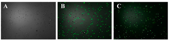Observation of the D-ESP and D-GSP entering the cell interior of ETEC K88 using a fluorescent microscope (800×): (A) ETEC-K88 treated with 2-AMAC; (B) ETEC-K88 treated with 2-AMAC-labeled D-ESP; and (C) ETEC-K88 treated with 2-AMAC-labeled D-GSP.