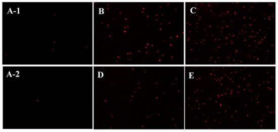 The effect of D-ESP and D-GSP on the cell membrane permeability of ETEC K88 under a fluorescent microscope (800×): (A-1,A-2) the control groups; (B) ETEC K88 treated with a 1MBC concentration of D-ESP; (C) ETEC K88 treated with a 2MBC concentration of D-ESP; (D) ETEC K88 treated with a 1MIC concentration of D-GSP; and (E) ETEC K88 treated with a 2MIC concentration of D-ESP.